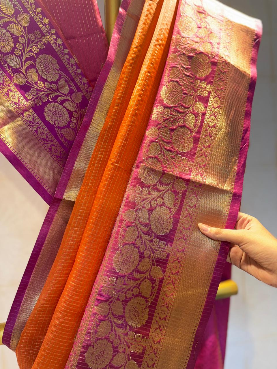 Make a stunning statement in this burnt orange tissue saree, where tradition meets understated glamour. The warm burnt orange hue symbolizes richness and celebration, while the soft tissue fabric adds a delicate shimmer. Effortlessly elegant, it’s an ideal choice for festivals, poojas, and evening events.